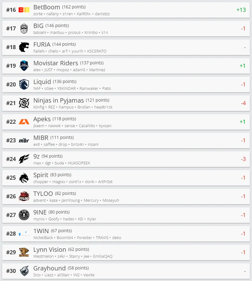 Удивительным ростом в топе команд показала BetBoom Team. Благодаря их выступлению на IEM Sydney 2023, они заняли 16-е место в рейтинге HLTV.org. FaZe Clan, благодаря победе на этом ивенте в Сиднее, вернулась на пятое место, в то время как Complexity Gaming заняла восьмую позицию.