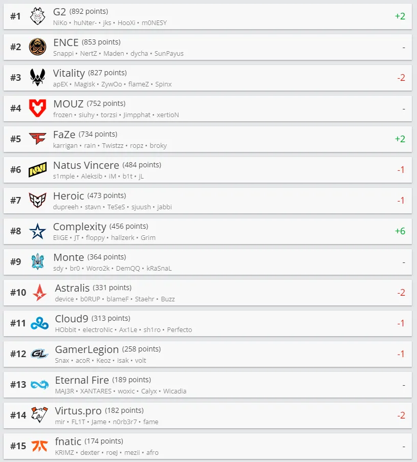 G2 Esports, с великолепным составом, заняла первое место в списке самых сильных команд в мире по версии HLTV.org. Команда, возглавляемая Расмусом "HooXi" Нельсоном, обошла ENCE и Team Vitality в этом рейтинге. С другой стороны, клуб Дана "apEX" Мадесклера опустился на третье место.