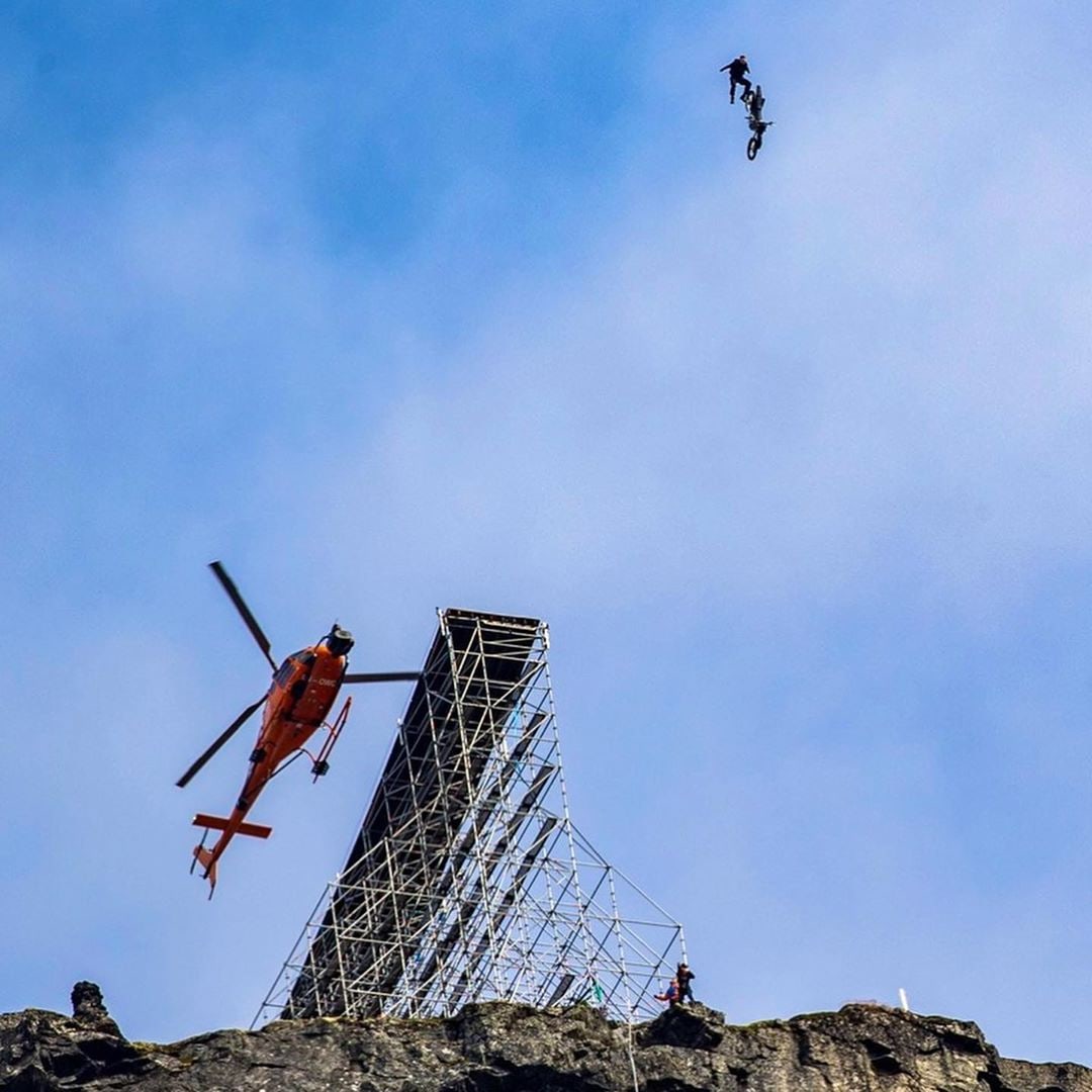 Режиссёр картины Кристофер МакКуорри недавно показывал в своём инстаграме фото огромного трамплина в горах, и именно на нём, в первый день съёмок Круз совершил невероятный прыжёк с использованием мотоцикла и парашюта, не используя каскадёров.